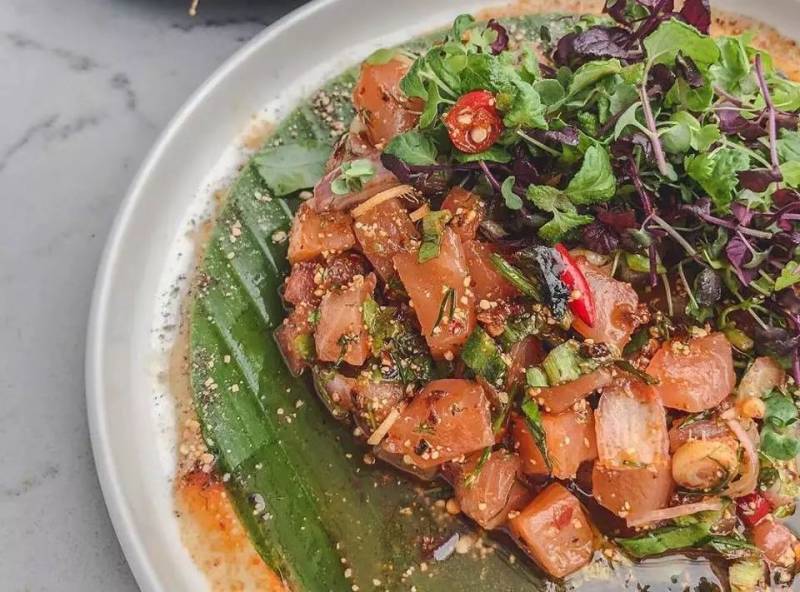 是泰国风味的三文鱼沙拉,酸辣开胃,