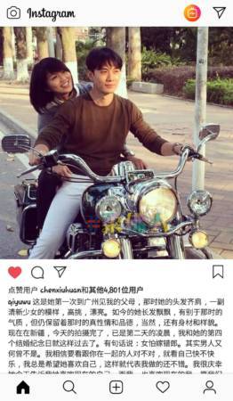戚玉武放了一张数年前,他与老婆白薇秀共骑哈雷摩哆的合照,并写道:“这是她第一次到广州见我的父母,那时她的头发齐肩,一副清新少女的模样,高挑,漂亮。如今的她长发飘飘,有别于那时的气质,但仍保留着那时的真性情和品德,当然,还有身材和样貌。”