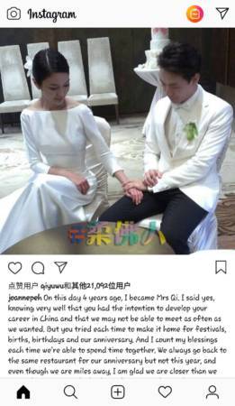 戚玉武与白薇秀庆祝结婚4周年。(取自网络)
