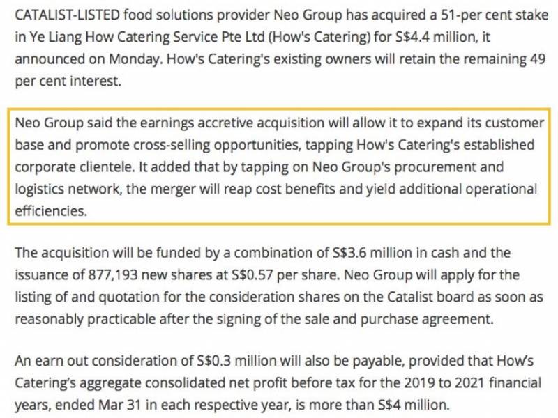 Neo Group表示,收益增加将使其扩大其客户群并促进交叉销售机会,利用How’s Catering的既定企业客户。它补充说,通过利用Neo集团的采购和物流网络,合并将获得成本效益并提高运营效率。