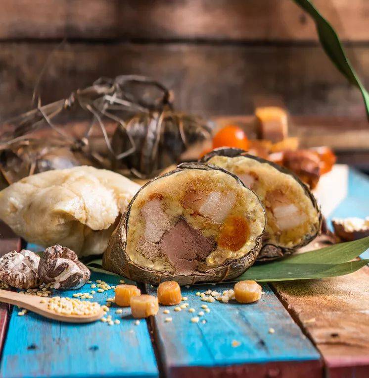 这款港式金华的囊蒸粽包含了丰富多样的材料,其中食材有香味儿浓郁的金华火腿,北海道瑶柱,烧肉及烧鸭等等。