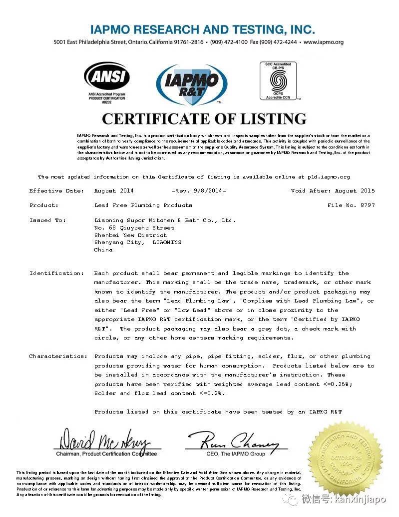 苏泊尔卫浴产品品质受到众多国际知名实验室的一致认可,比如美国NSF及欧洲DVGW用水标准,还有ISO9001质量管理体系认证、ISO14001环境管理体系认证等。