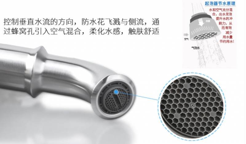 苏泊尔的起泡器可以让水和空气充分混合,让水流有发泡的效果,有了空气的加入,尽管限制了流速,但水的冲刷力提高不少,水流更加柔和不会飞溅,还能达到减少用水量的目的。