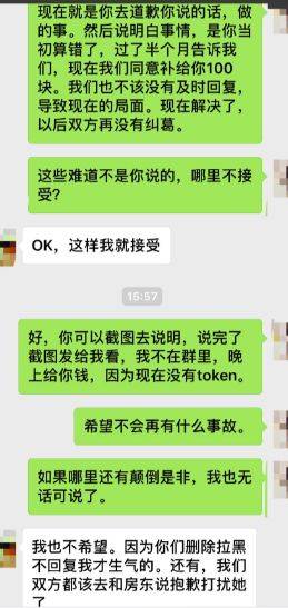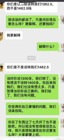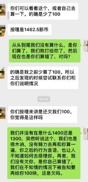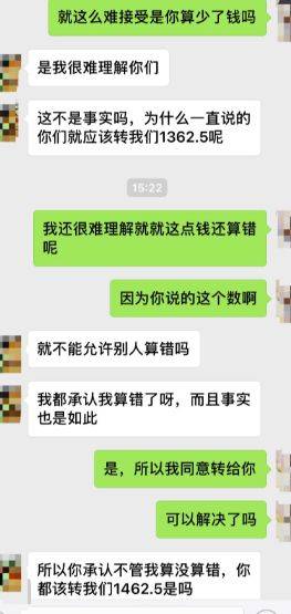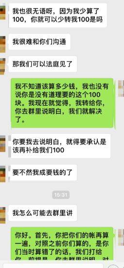 过了大半个月,她突然发信息给我说当初她们算错了,少了100块,要我们打钱。