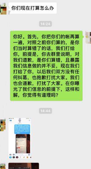 之后,她在一个500人的群里暴露我们信息,颠倒是非,说我们欠她。
