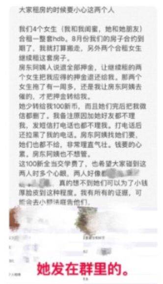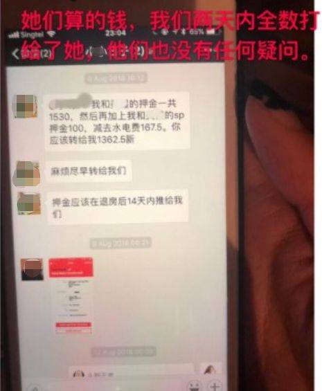 在这期间,因为我们回国了没有及时打钱,她们就以威胁的语气让我们和房东说不能拖太久,会违法。这里已经让人很不愉快了。转给她们钱后,我们就删了她们的微信,因为觉得不会再联系了。