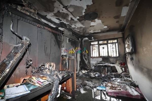 失火房间瞬间被烧得面目全非,只剩下床架及一地的灰烬。(图自联合晚报)
