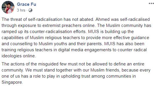 广告傅海燕今天(12日)在Facebook发布帖文表示:“自我激进化所带来的威胁并未减弱。Ahmed是通过接触网络上激进的传教士而自我激进化。”