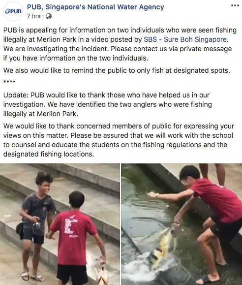 PUB便在脸书页面上发文,呼吁公众提供任何关于那2名少年的信息,并且提醒公众只有指定的地区才允许钓鱼。