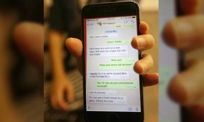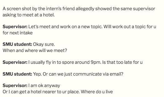 签约当天,她被男主管告知,主管在新加坡经常预订的酒店就在女学生的家附近。当时她并没有想太多,但在那之后,主管无缘无故发了一个“晚安”的简讯给她。