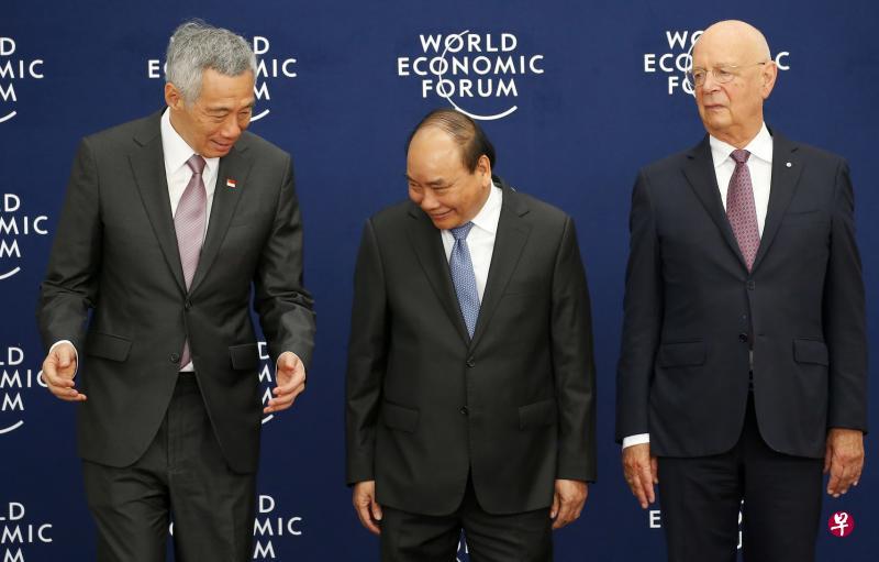 李显龙总理(左起)昨天在世界经济论坛东盟会议欢迎仪式上和越南总理阮春福和世界经济论坛创办人施瓦布留影。(法新社)