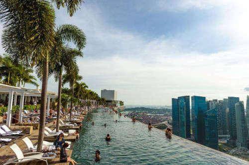 滨海湾金沙酒店以三栋塔楼顶端托著外型像船只的悬壁平台,55层楼高距离地面200米的无边际泳池眺望整个滨海湾,其中最著名即是“无边际泳池”,是许多游客即使没有住酒店也要买票上楼在一旁观看无边际泳池及登高望远周边景致。电影中男主角Nick向女主角Rachel求婚后的派对,就是包下滨海湾金沙的空中餐厅CÉ LA VI,伴随着烟火狂欢,同时在天台花园的无边际泳池上演一幕精彩的水中芭蕾表演。