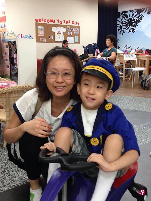 傅美珍与患罕见PURA综合症的儿子陈靖轩。(受访者提供)