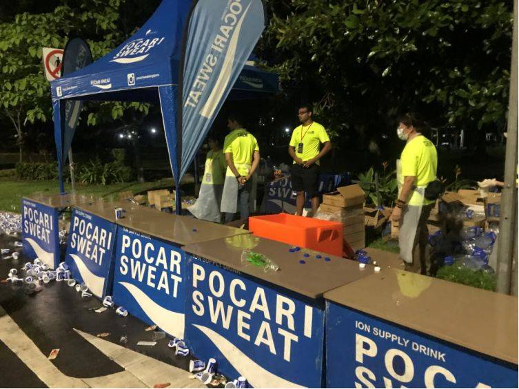 很快就到了10公里处补水站。然而,悲催了。水全给派完了!现场简直就是秋风扫落叶: