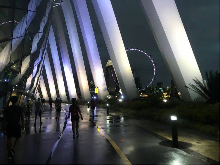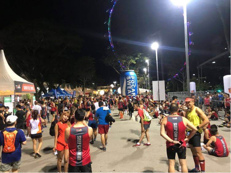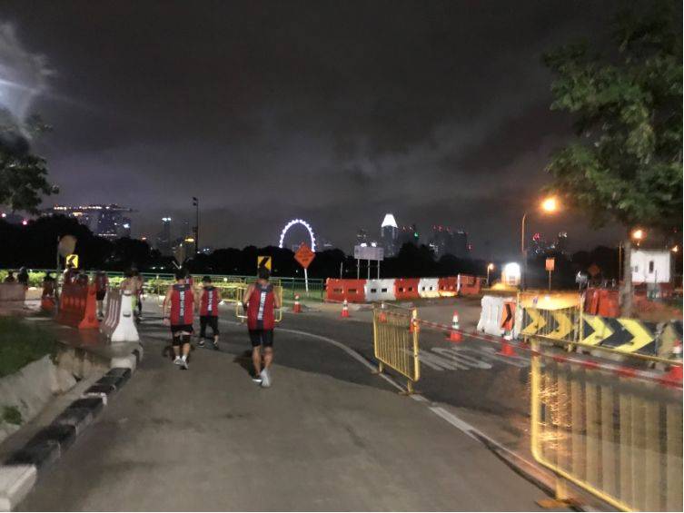出了地铁站,走了几百米,就到了赛场。赛场已经是people mountain people sea。赛场后面就是新加坡摩天轮。话说回来,好些外国朋友听到“新加坡眼”,都以为说的就是这个摩天轮: