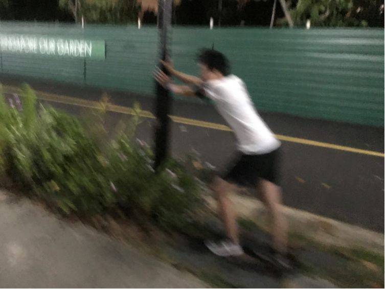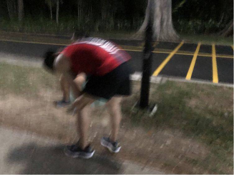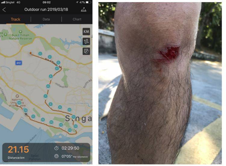 4天后,3月18日,本来打算跑14公里。清晨开跑之后,越跑越顺,索性加到21公里,一直跑到NUS商学院,然后再往回跑,跑到巴西班让地铁站,就在快跑完21公里的最后500米,由于疲乏,肢体丧失了平衡能力,脚下踩到个小石头就摔个大跤。左腿膝盖挂彩了。
