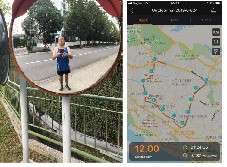 照片说明:4月19日的跑步感觉不错,还自拍了(左);没想到,5天后,本来计划跑16-18公里,却只跑了12公里就受伤了。