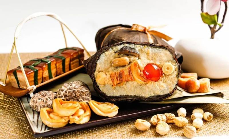 这款港式金华的囊蒸粽包含了丰富多样的材料,其中食材有香味儿浓郁的金华火腿,北海道瑶柱,烧肉及烧鸭等等。