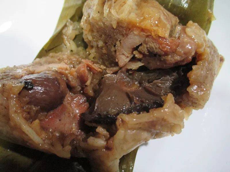 这扎实的用料都快溢出屏幕了,大块大块的肉还有甜甜的栗子,一看就知道是个实诚的粽子了!