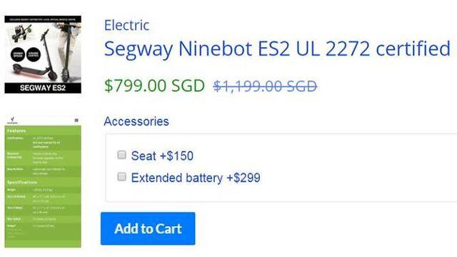 广告本地至少两家个人代步工具零售商,Falcon PEV和网络零售商scootersg,提供赛格威Ninebot ES2型号车款。