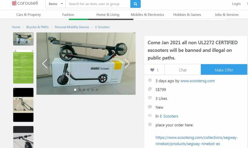 而scootersg自星期一新管制宣布后,便“对症下药”地进行产品行销,包括在其网站上以及网购平台Carousell发布多条贴文,着重强调这款型号已通过UL2272的标准认证。