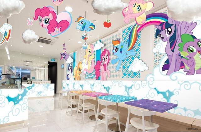 广告在店铺装饰上超级少女心,从餐桌、餐椅,到壁画、挂饰,咖啡馆上上下下,里里外外都以彩虹小马为主题