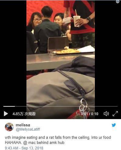 13日早上有网友在社交媒体推特上传了一段视频,该网友在位于宏茂桥的一家麦当劳用餐时,一只老鼠从天花板落下,在一盘装着薯条的托盘旁窜动。