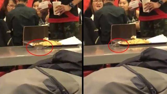 从视频中看,老鼠好像想从托盘下面够到什么东西 也许是薯条?!又或者是老鼠被托盘压到在挣扎。而且周边的顾客似乎都没有发现,只有站在托盘座位的小哥有点不知所措。