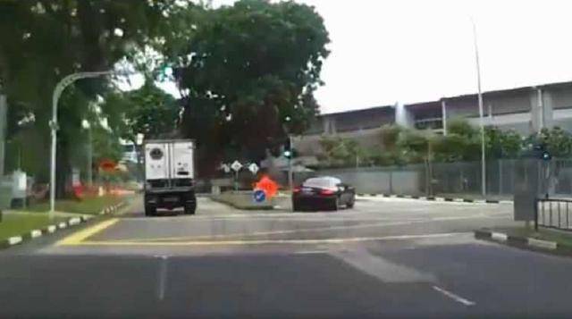 跑车险些撞上交通灯和迎面驶来的德士以及轿车。