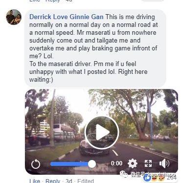 (翻译:一天,我以正常的车速行驶在路上,一辆玛莎拉蒂突然出现,紧紧跟在我车尾,然后又突然超车,跑到了我前面,还多次无故刹车。致玛莎拉蒂司机:如果你对我发的这个帖子不爽,随时私信我,我等著。)