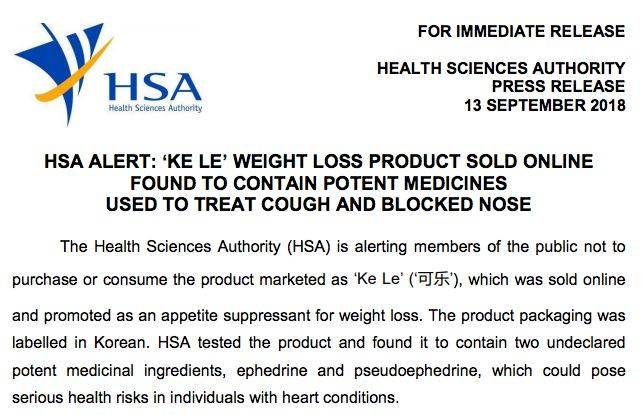 新加坡卫生科学局(HSA)于9月13日发布文告说,本地有一种减肥产品被查出含有两种未申报的强效药用成分,会严重危害健康。