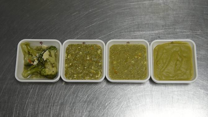 比如,糊状食物是特别为喉部或舌头无力的病人准备的。食疗技师Jocelyn Huang形容,糊状食物像是泥状的婴儿食品。