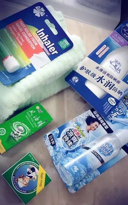 原来,这个蓝色小包里面装的是一些在新加坡生活不可缺少的用品,比如降温用品、毛巾、清凉油、防晒霜等等。空姐空少们也是挺细心的呀~