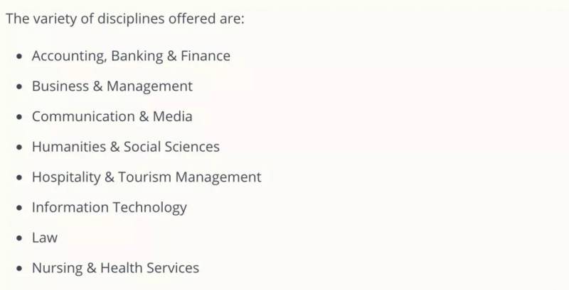 学校的课程从语言课程开始,到foundation课程、再到对应的大专课程。大专课程除了常见的商科专业,如会计、商业管理、酒店管理;还有信息技术、法律、护理等学科供大家选择。