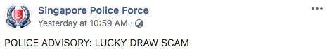 除此以外,新加坡警方也发布贴文,提醒公众要小心关于幸运抽奖的诈骗行为!