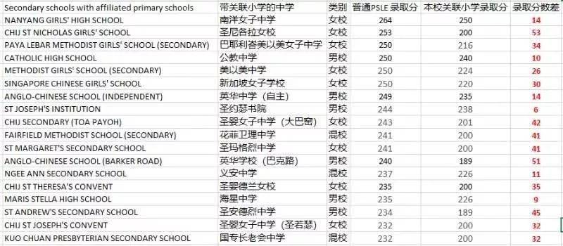 以下是2018年PSLE录取分数线排名在前五十里,具有关联小学的一些中学的录取分数线差别(原始数据来自MOE官网):