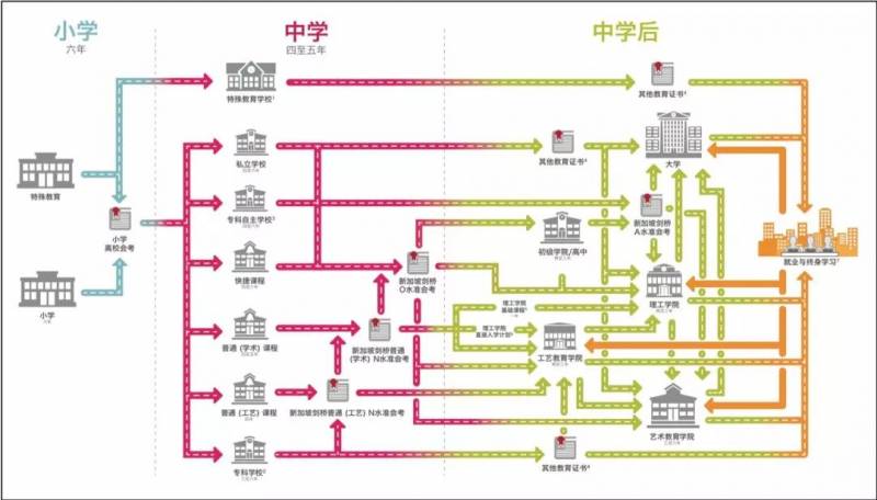 * 该图展示了新加坡公立教育系统升学路径,能够进入直通车中学和名校中学快捷班课程的孩子,在通向优质高等教育的路径上会少经历许多“坎坷”。