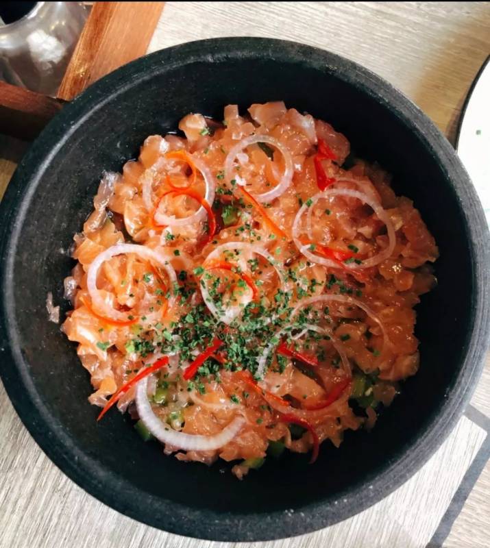 再推荐一个油浸三文鱼冷盘,每一口都是满满的生鲜三文鱼肉丁,有种坐在巴塞罗那的沙滩边看海景的错觉。