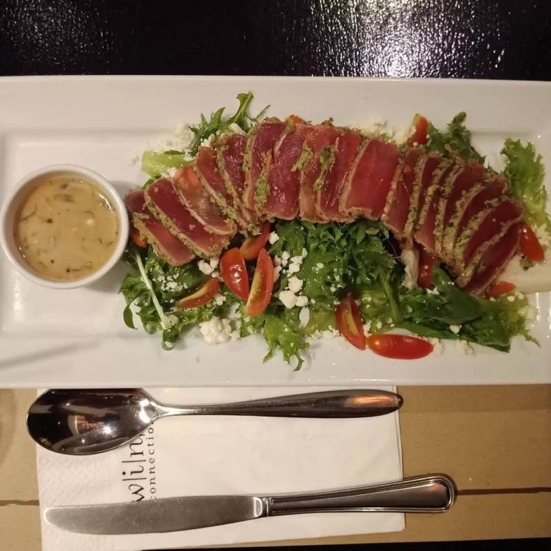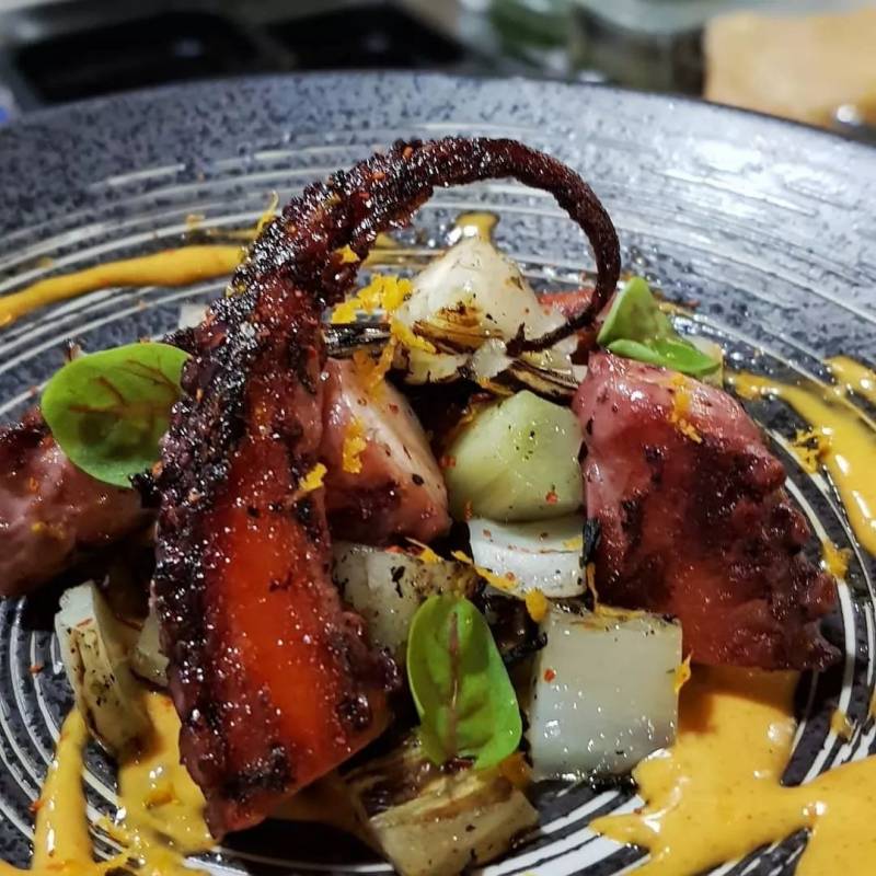 推荐的菜有烤章鱼段,这个本就是经典的西班牙菜,厨师的火候掌控的很好,表面看起来焦黑,里面却是鲜嫩弹牙又多汁!搭配烤制的酥脆的面包碎、爽嫩的洋葱丁,还有烟熏辣椒蛋黄酱,是地道的西班牙口味。