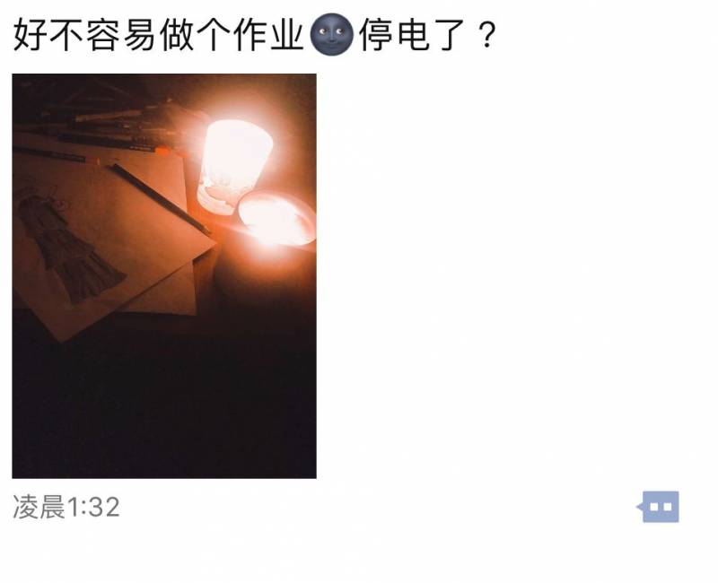 朋友圈里的这位朋友本来想写作业,但停电了,于是点起了蜡烛。还挺浪漫的是不是?有没有引起大家小时候一写作业就万分期待停电,好跟小伙伴出去玩的回忆?