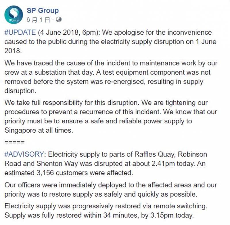 其实这不是今年新加坡发生的第一起停电!最近一次小规模停电发生在今年6月1日下午2点41分,在Raffles Quay, Robinson Road 和 Shenton Way有3156人受到影响,新能源集团在34分钟内恢复电力,并发表了道歉声明。