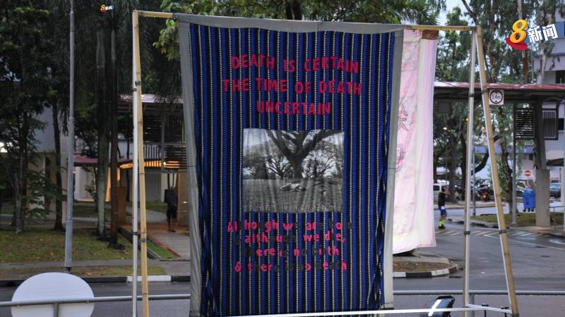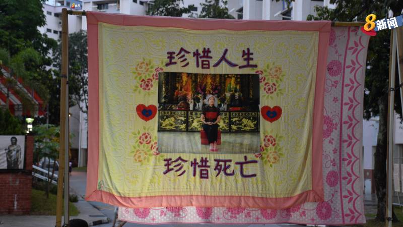 亲友为表悼念送上俗称“竹”的丧礼被子,是四个艺术工作坊之一《珍惜和紧握》中,长者们的其中一份“作业”。此外,他们还需拍下一张,想像自己死亡前最后一个姿势的照片,印在被单上。