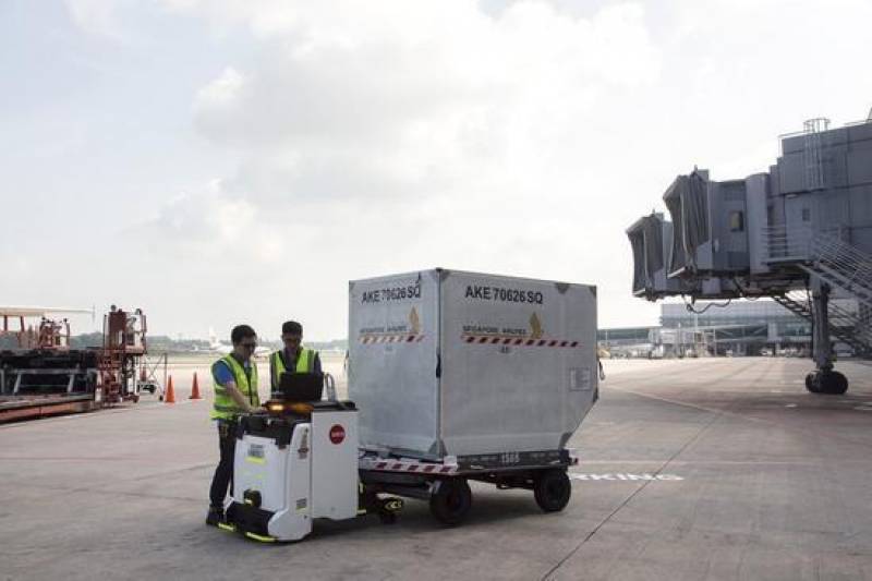 樟宜机场停机坪上的自动货柜拖车(ACT)行李机器人
