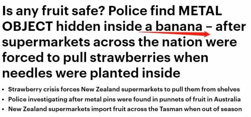 在这之前澳媒报道,昆州警方正在调查一起香蕉里藏有Metal Object(金属物)的恶性事件。