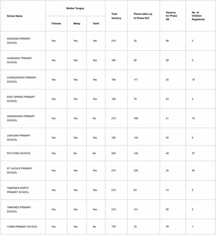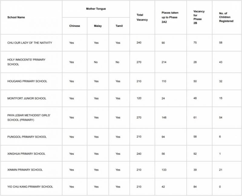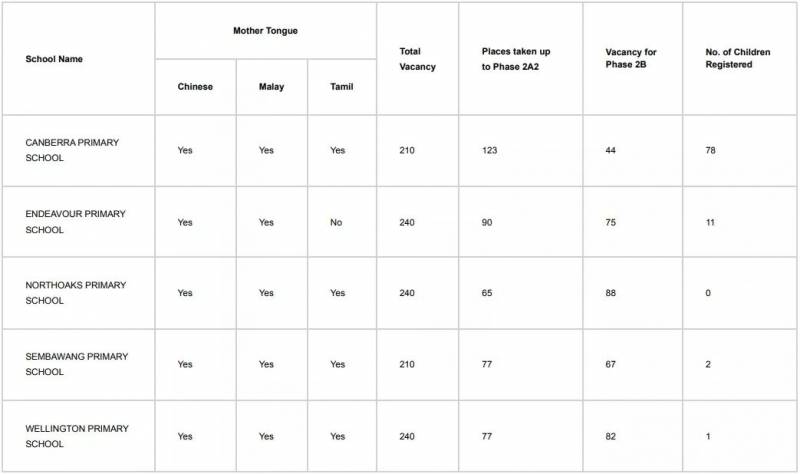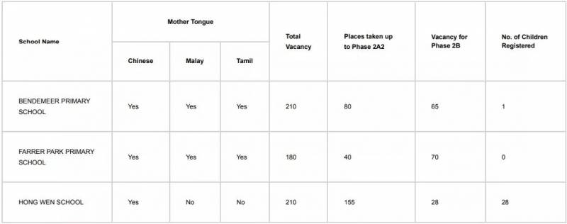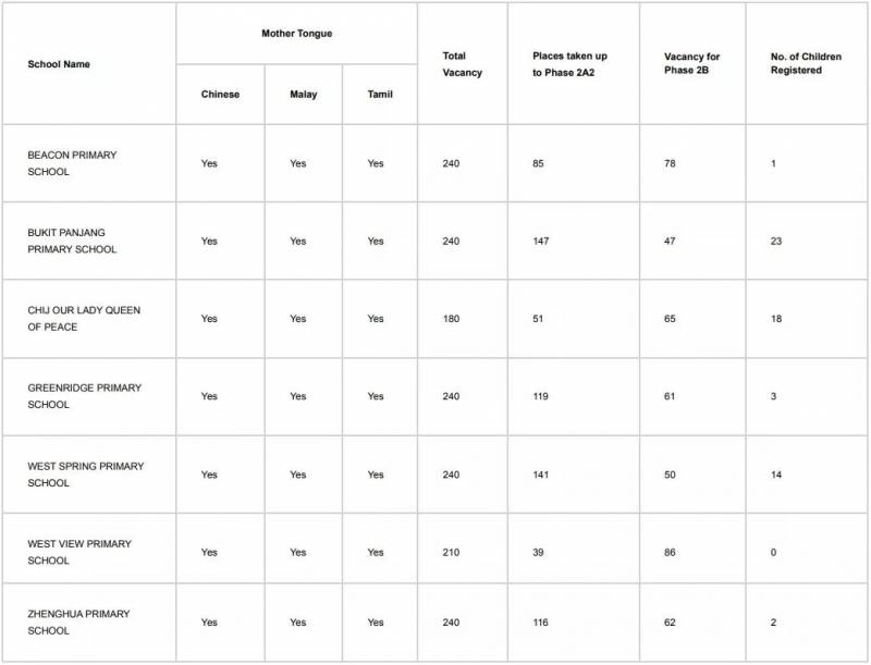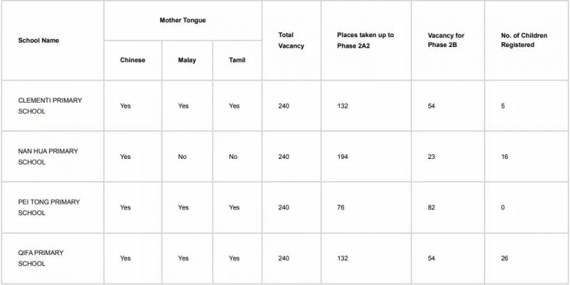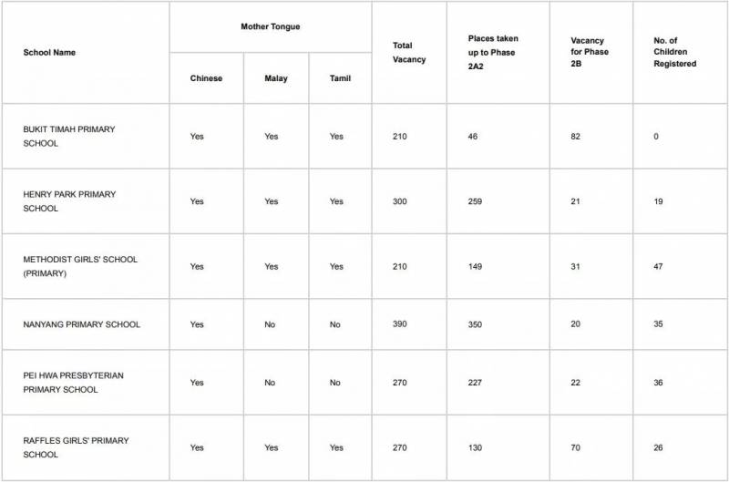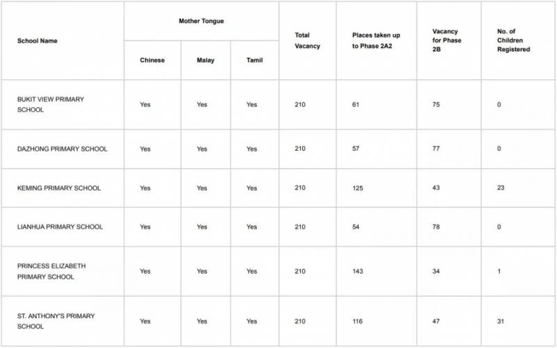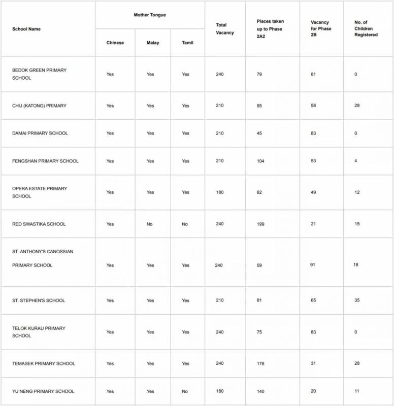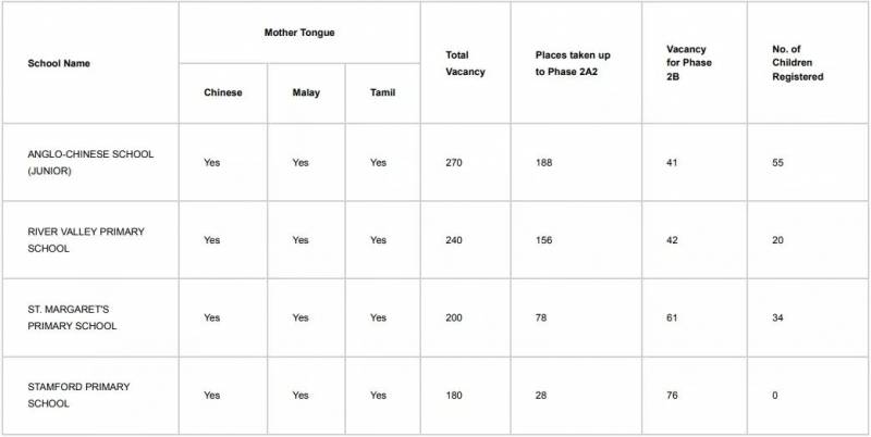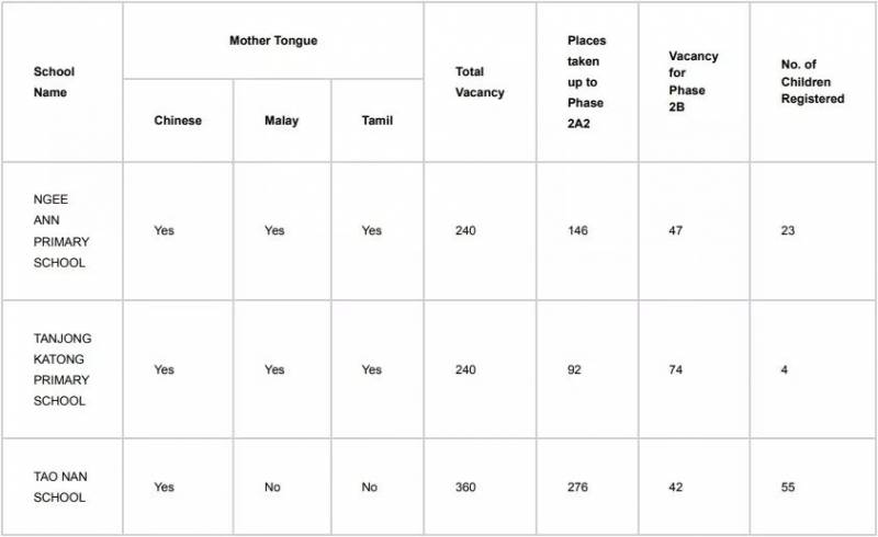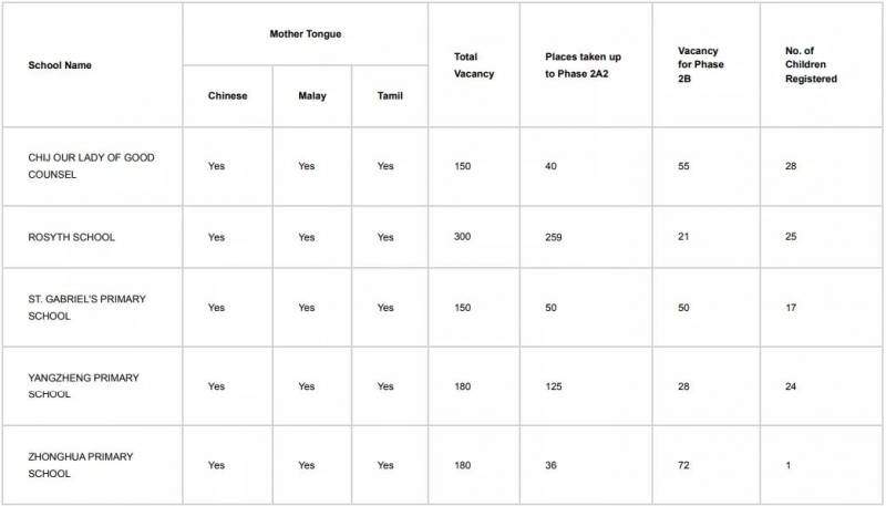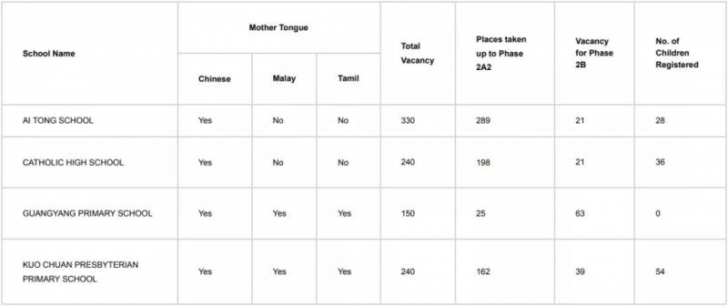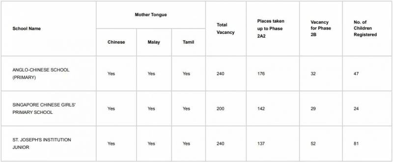 其中“Mother Tongue”表示学校所支持的母语课程,“Total Vacancy”表示学校在小一直入阶段所提供的总学额,“Places taken up to Phase 2A(2)”表示至2A2阶段已经被占用的学额,“Vacancy for Phase 2B”表示学校在2B阶段所剩的学额。