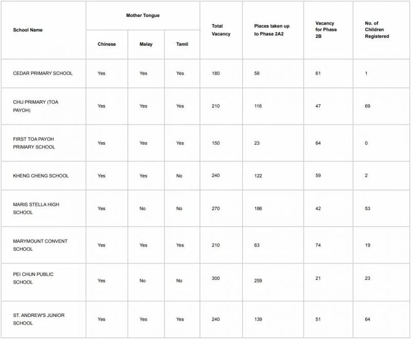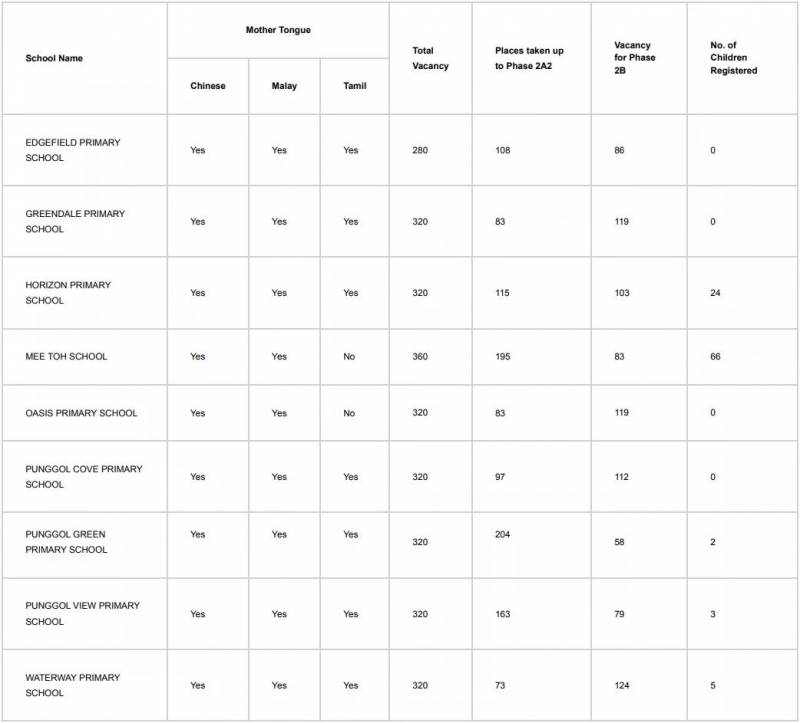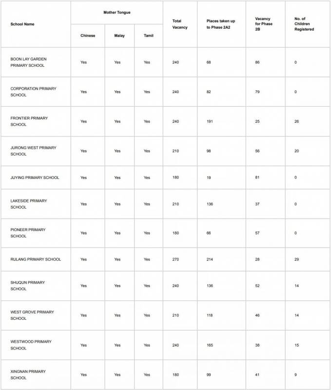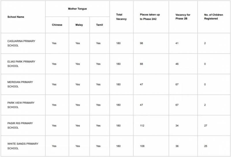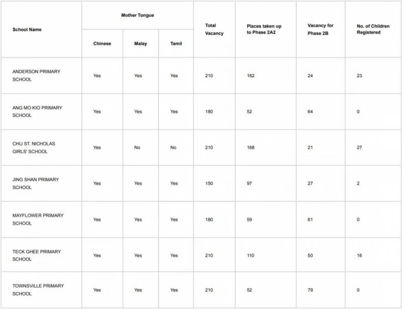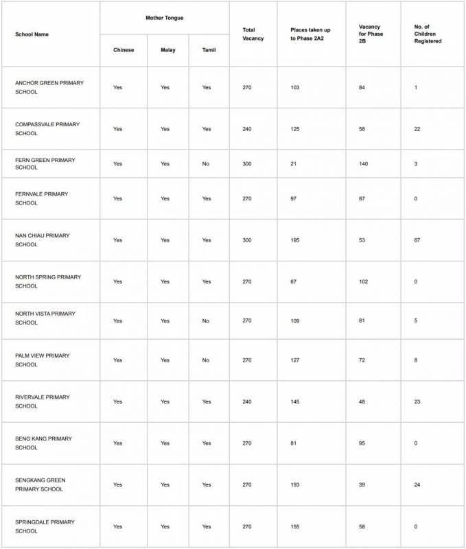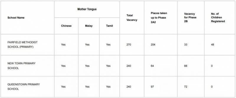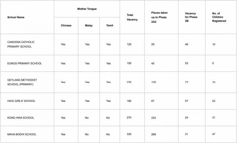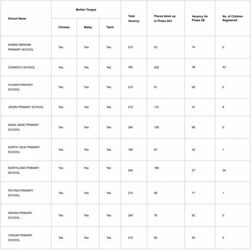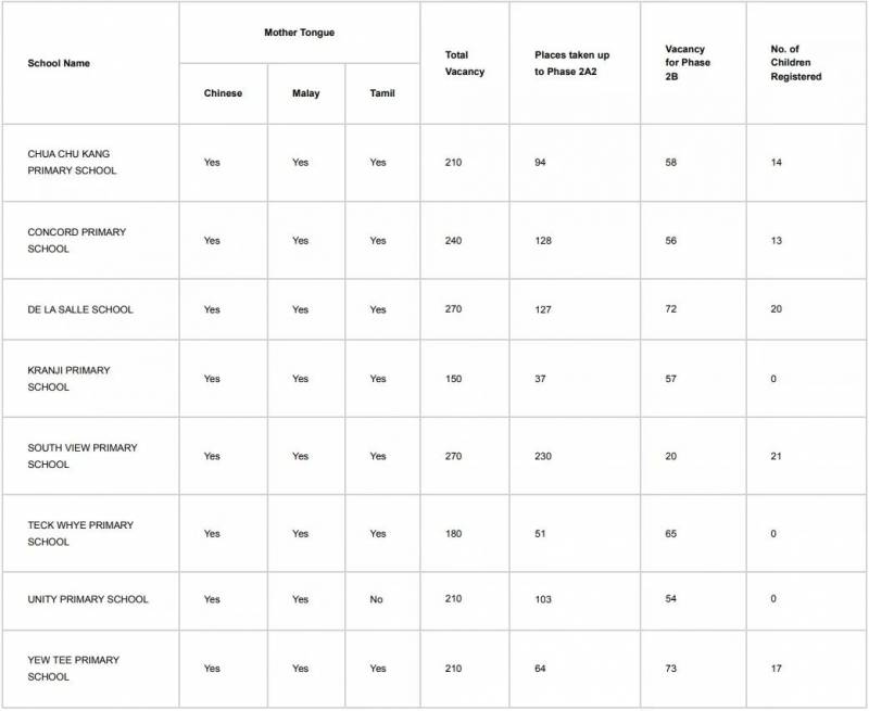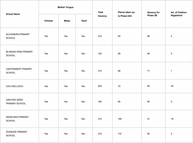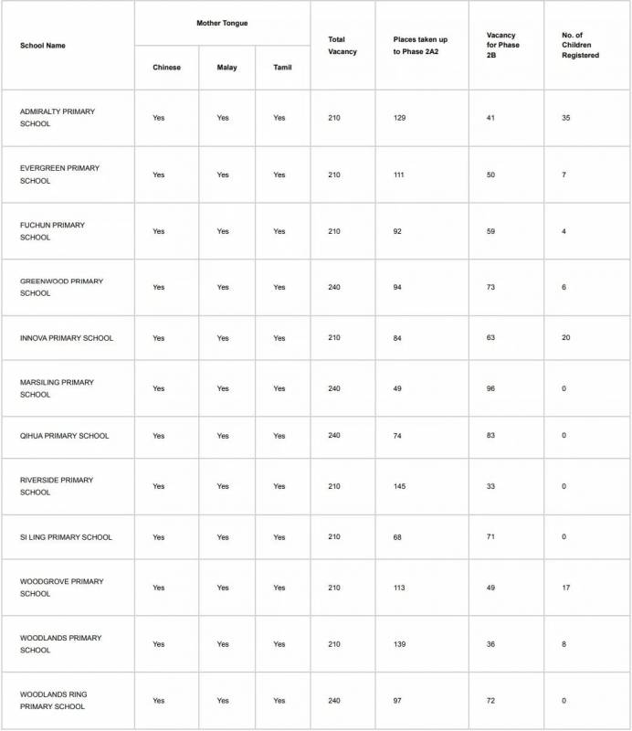 其中“Mother Tongue”表示学校所支持的母语课程,“Total Vacancy”表示学校在小一直入阶段所提供的总学额,“Places taken up to Phase 2A(2)”表示至2A2阶段已经被占用的学额,“Vacancy for Phase 2B”表示学校在2B阶段所剩的学额。