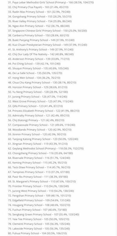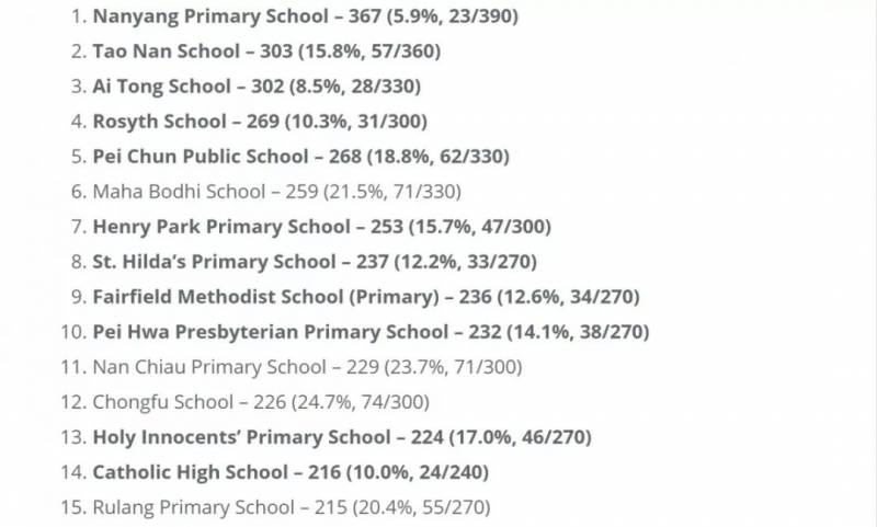 括号外数字表示“至2A2阶段已经被占用的学额”,括号内%表示“2B阶段所剩学额占总学额的百分比”,数字表示“在2B阶段所剩的学额”和“小一直入阶段所提供的总学额”,空缺率低于20%的学校以粗体强调。
