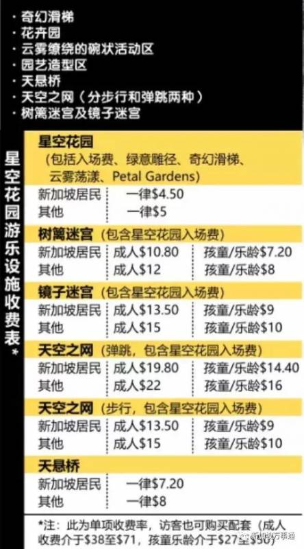根据最新公布的价格,星空花园游乐设施门票要价最低从4.5元新起,部分设施额外收费7.2新元到19.8新元不等,大家可根据喜好选择不同配套搭配。而想要一次过玩遍所有设施,成人需支付54新元,孩童和年长者收费39新元。