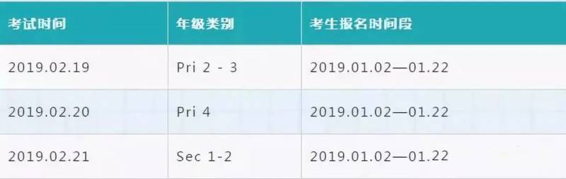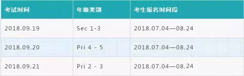 具体考试日期为:小二和小三的考试日期为9月21日,小四和小五的考试日期为9月20日,而中一到中三的考试日期为9月19日,爸爸妈妈们千万要记住哦!
