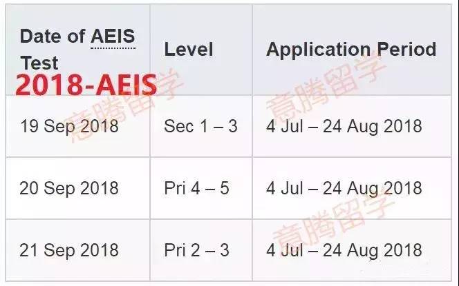 今年新加坡中小学(AEIS)考试报名的日期是7月4日-8月24日,考试的时间为9月19、20和21日共3天。
